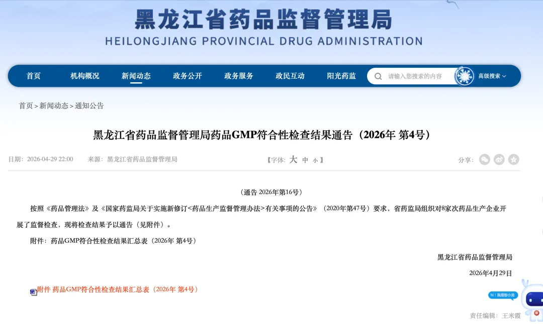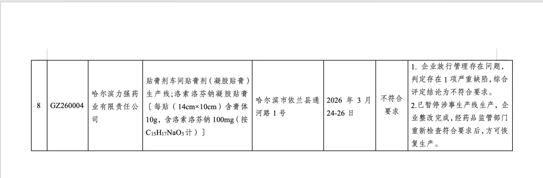 据黑龙江省药品监督管理局官网4月29日发布《GMP符合性检查结果通告(2026年 第4号)》:哈尔滨力强药业有限责任公司的贴膏剂生产线因不符合GMP要求,被暂停生产。