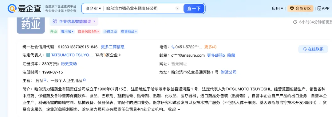 据《爱企查》资料,哈尔滨力强药业有限责任公司成立于1998年07月15日,注册地位于哈尔滨市依兰县通河路1号,法定代表人为TATSUMOTO TSUYOSHI。