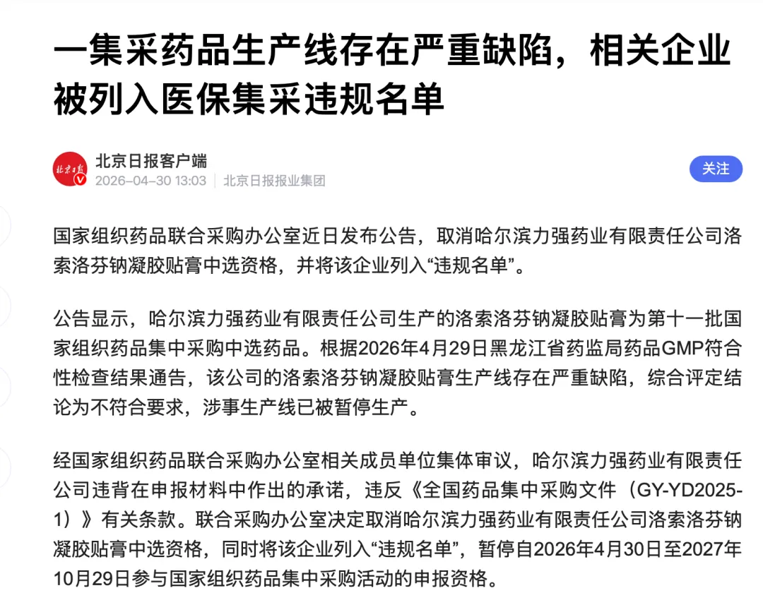 据《北京日报》客户端消息,哈尔滨力强药业有限责任公司生产的洛索洛芬钠凝胶贴膏为第十一批国家组织药品集中采购中选药品。经国家组织药品联合采购办公室相关成员单位集体审议,哈尔滨力强药业有限责任公司违背在申报材料中作出的承诺,违反《全国药品集中采购文件(GY-YD2025-1)》有关条款。联合采购办公室决定取消哈尔滨力强药业有限责任公司洛索洛芬钠凝胶贴膏中选资格,同时将该企业列入“违规名单”,暂停自2026年4月30日至2027年10月29日参与国家组织药品集中采购活动的申报资格。