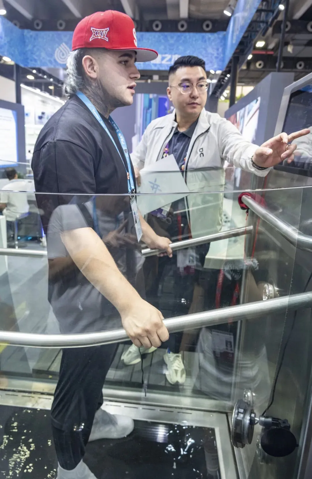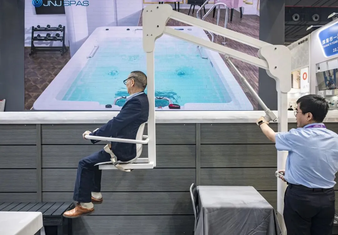 他还展示了可通过升降将行动不便的老人送入泳池的架子,以及一款水中康复设备,“可以利用水的浮力减轻身体压力,让术后康复者或中风人士能较轻松地进行运动训练”。