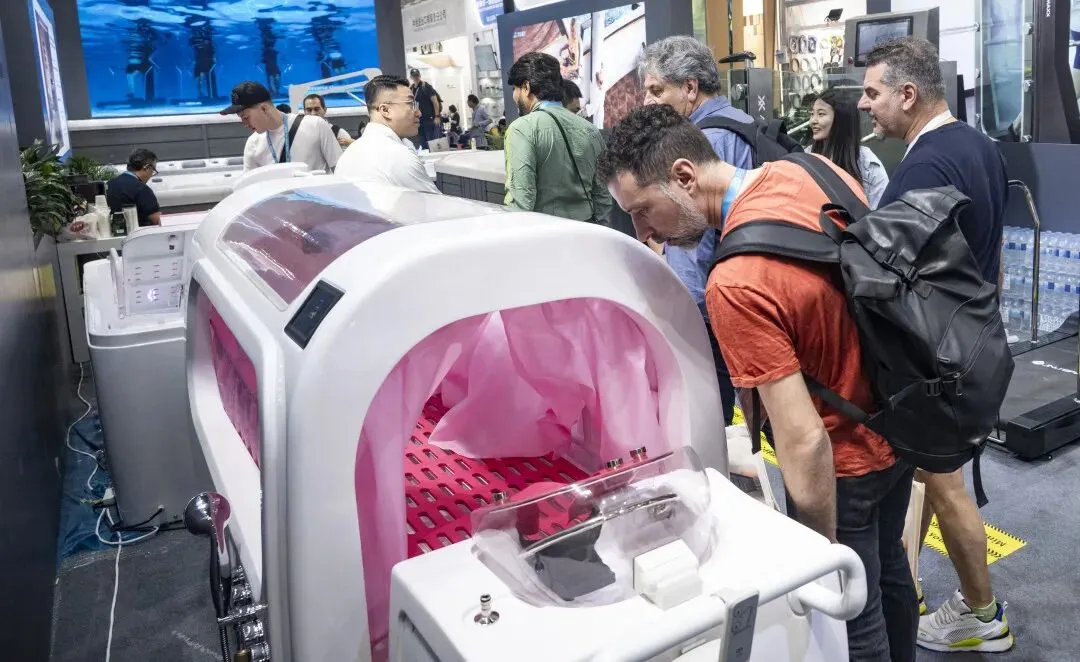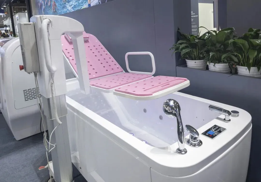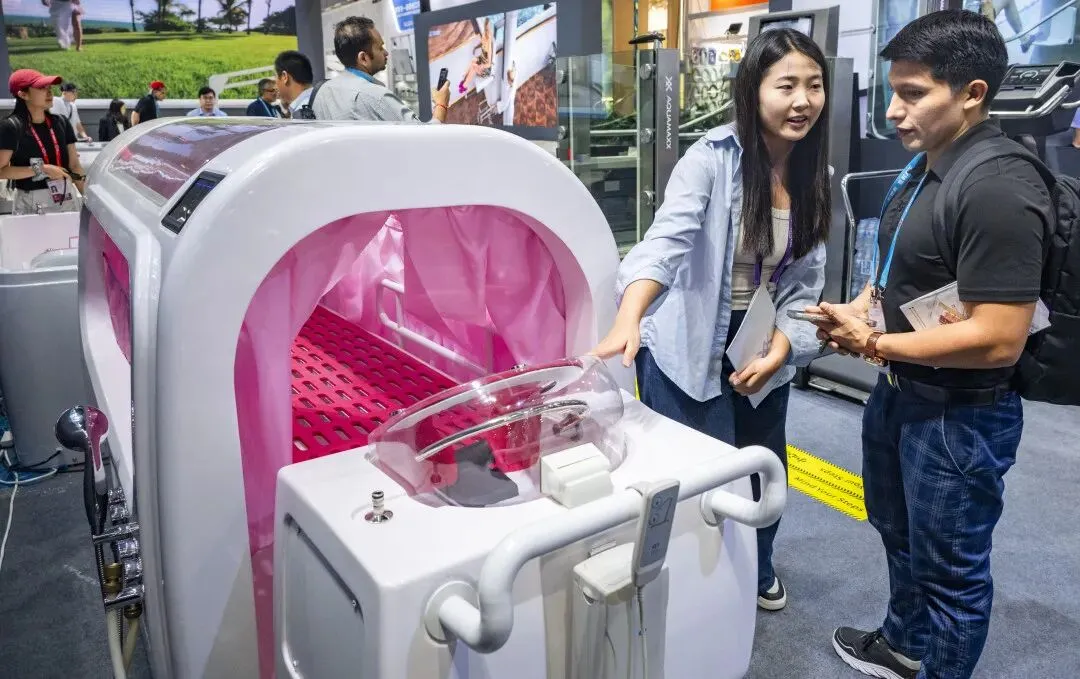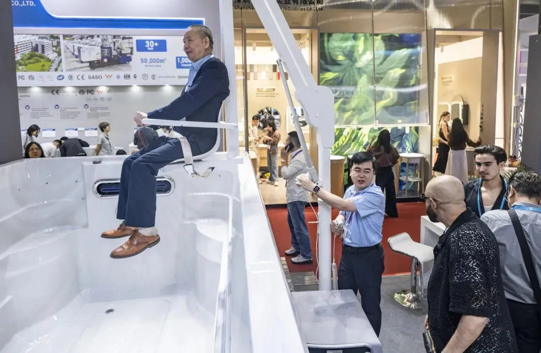 可以协助长期躺卧的长者洗头、淋浴或泡澡的助浴器,协助腿脚不便的长者进入泳池进行康复训练的升降架,仅比普通马桶高出8cm就可以方便长者坐起的马桶……在广交会,一系列具有“适老化”特性的展品吸引外国客商的驻足和咨询。