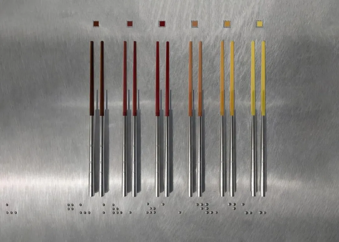 最后一款设计出自中国设计师Ellen Hu之手,她是伦敦 Haus of Hu 工作室的创始人。她设计了一双色彩缤纷的筷子,筷子放置在一个刻有盲文的表面上。