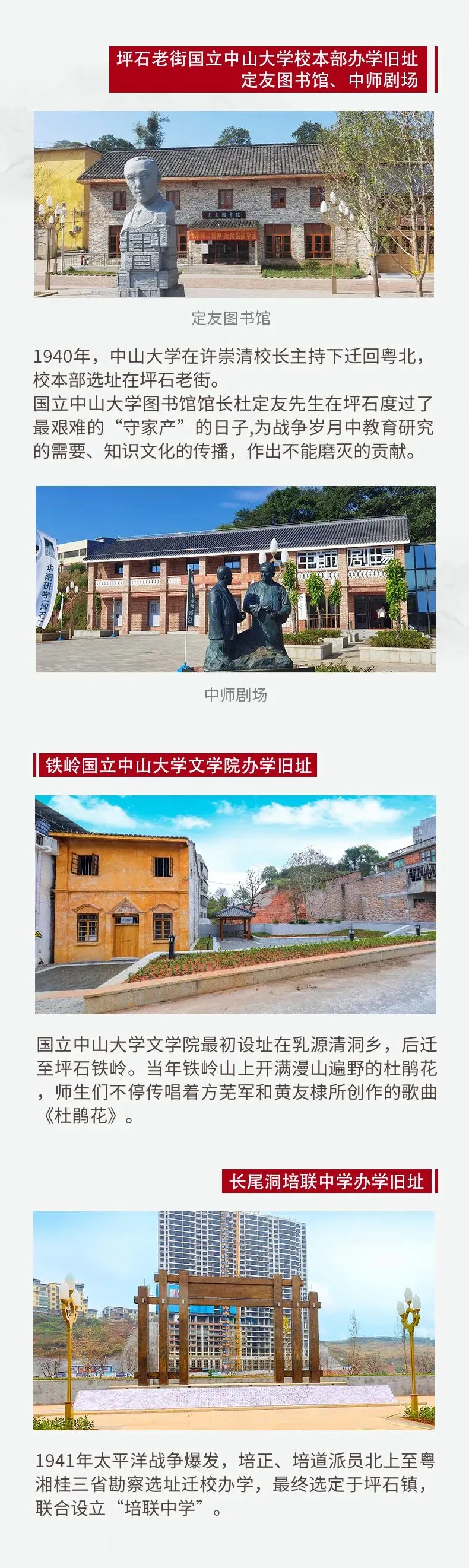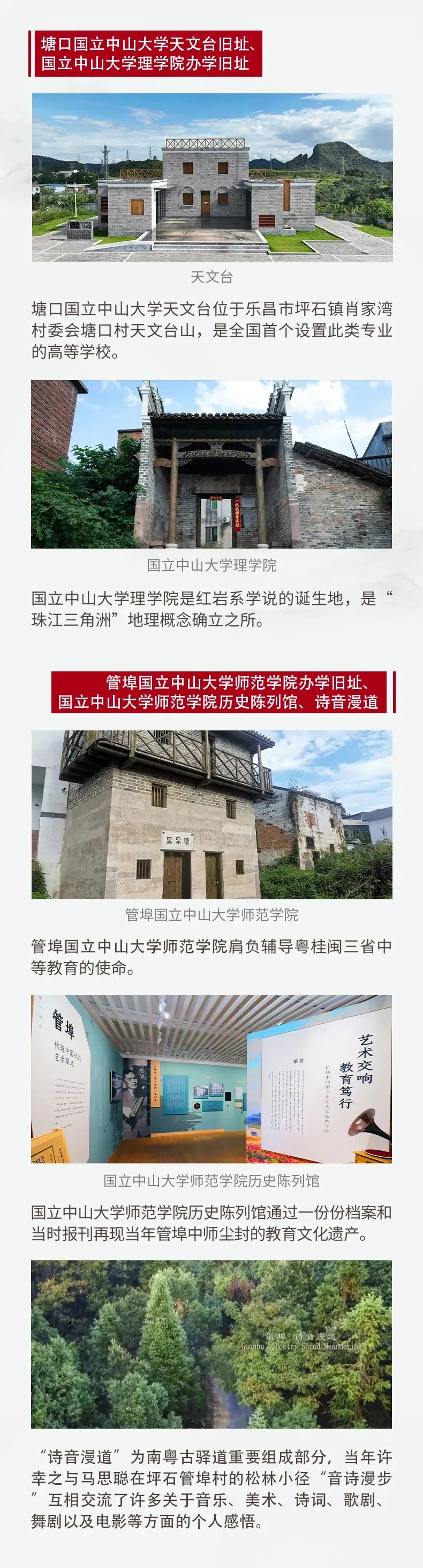 (1)武阳司国立中山大学法学院办学纪念地、亚南书舍、《资本论》与中国经济教育历史陈列馆“真理光芒——《资本论》传播最早的课堂”、李达书舍“明灯引路人”→(2)三星坪国立中山大学工学院办学纪念地→(3)新村国立中山大学工学院办学纪念地“抗战时期中山大学迁徙历程展”→(4)坪石老街国立中山大学校本部办学纪念园、定友图书馆“与图书共存亡——中国图书馆界一代宗师杜定友在抗战中”、中师剧场→(5)铁岭国立中山大学文学院办学纪念地→(6)长尾洞培联中学办学纪念地→(7)塘口国立中山大学理学院办学纪念地、塘口国立中山大学天文台遗址→(8)管埠国立中山大学师范学院办学纪念地、管埠国立中山大学师范学院教育历史陈列馆“艺术交响 教育笃行”、左联纪念馆“从多伦路到管埠村——在粤北的乡野寻找‘左联’的星火”文献展、诗音漫道。