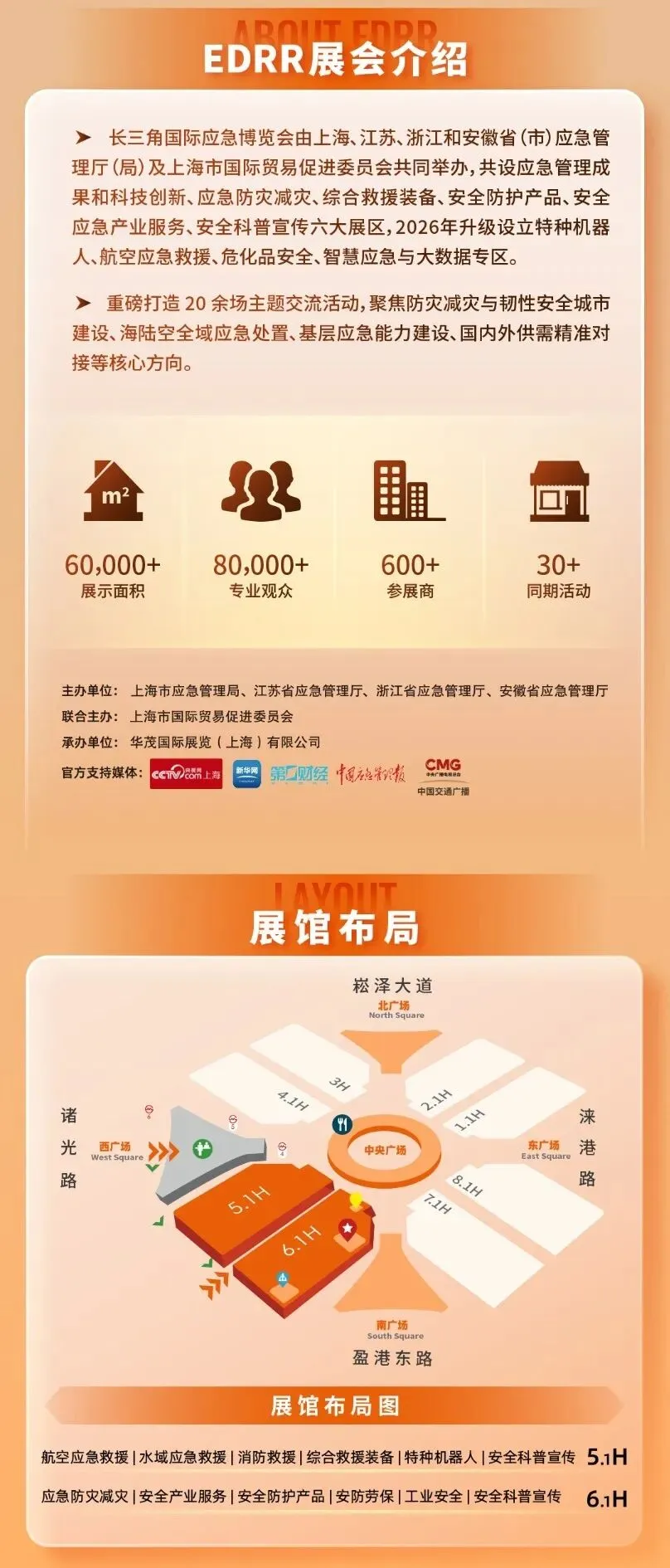 2026年5月7日至9日,第五届长三角国际应急减灾和救援博览会将在上海国家会展中心举办。本届博览会以“高水平安全服务高质量发展——应急就在你我身边”为主题,预计吸引超过500家国内外应急管理领域企业参展,专业观众将突破6万人次。