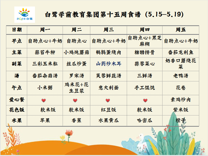 【白鹭·保健】美好“食”光|白鹭学前教育集团第十五周食谱5.15-5.19