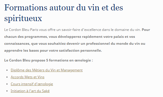 蓝带学校的教学团队由国际顶级美食专家组成,同时该校的酿酒师,侍酒师,酒窖大师等不同项目为学生提供了探索复杂葡萄酒世界的不同途径, 课程范围从入门到专业知识,从品尝食物和葡萄酒搭配到葡萄园游学等等,努力为学生提供不寻常的教育,将理论知识和实践紧密地联系在一起。