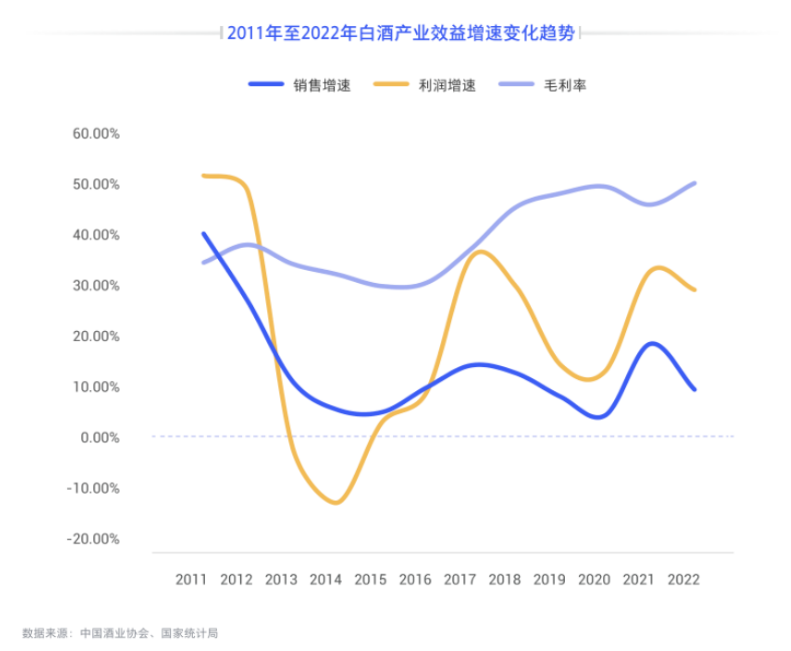 白酒销售额增速放缓,但利润仍在高位。从2018年至2022年的白酒销售额历史趋势图来看,白酒行业的总体销售额整体还是稳步上升的状态:2018年销售额为5,364亿元,2022年为6,626亿元,提高约24%;2021年,白酒规模以上企业实现利润总额1,702亿元,同比增长32.95%;2022年,白酒规模以上企业实现利润总额2,202亿元,同比增长29.36%,平均毛利率50.21%,比2021年末(45.99%)增长4.22个百分点。