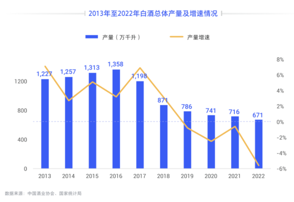 整体产量规模负增长,产量继续下滑。中国白酒行业的总产量近年来呈现下滑趋势。自2017年以来,白酒的年总产量便开始逐年下降;随着产量增速的持续下跌,2019年起产量开始出现负增长,产量增速为-0.8%,2022年该值下滑至-5.6%。2022年,纳入到统计局范畴的规模上白酒企业完成酿酒总产量仅为671万千升,较2017年(1,198万千升)下降约44%。