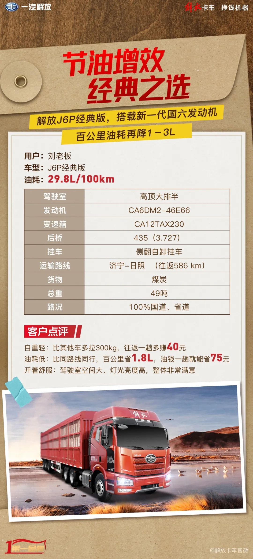 名车博览 | 车货总重49吨,百公里油耗29.8L,J6P经典版真省!