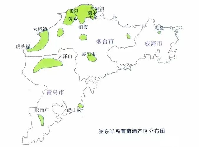 主要有胶东半岛北部的烟台及胶东半岛南部的青岛产区。现代葡萄酒企业先锋张裕便坐落在烟台,作为烟台产区代表的蓬莱更是聚集了众多知名酒庄,如君顶、国宾、拉菲集团在国内成立的瓏岱酒庄等。青岛的著名酒庄有九顶、鸿雅、华东百利酒庄等。