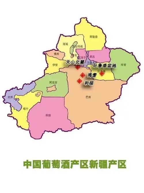 以天山为界,新疆的四个子产区分别环绕分布于四周,北部的天山北麓、西部伊犁河谷产区东部和硕-焉耆盆地和南部的吐鲁番-哈密产区。天塞、中菲、国菲等酒庄便是位于和硕盆地。