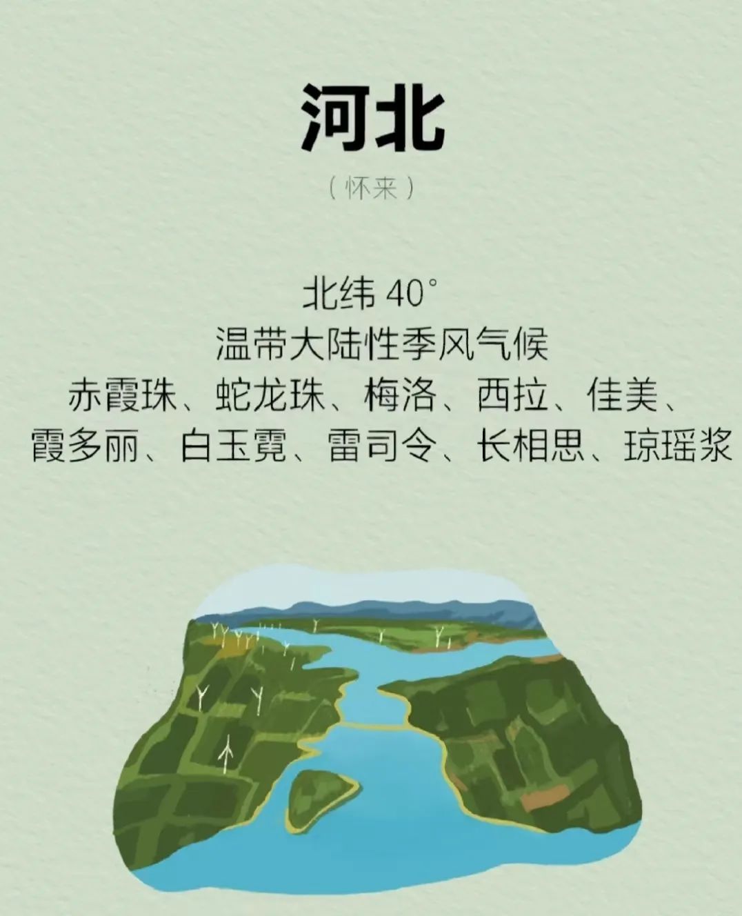 河北的葡萄种植历史非常悠久,是中国的第一瓶干白和干红葡萄酒的诞生地。主要的产区是怀来,怀来有着典型的温带大陆性季风气候,南北临山,且有多条河流过境,形成了得天独厚的葡萄生长环境。