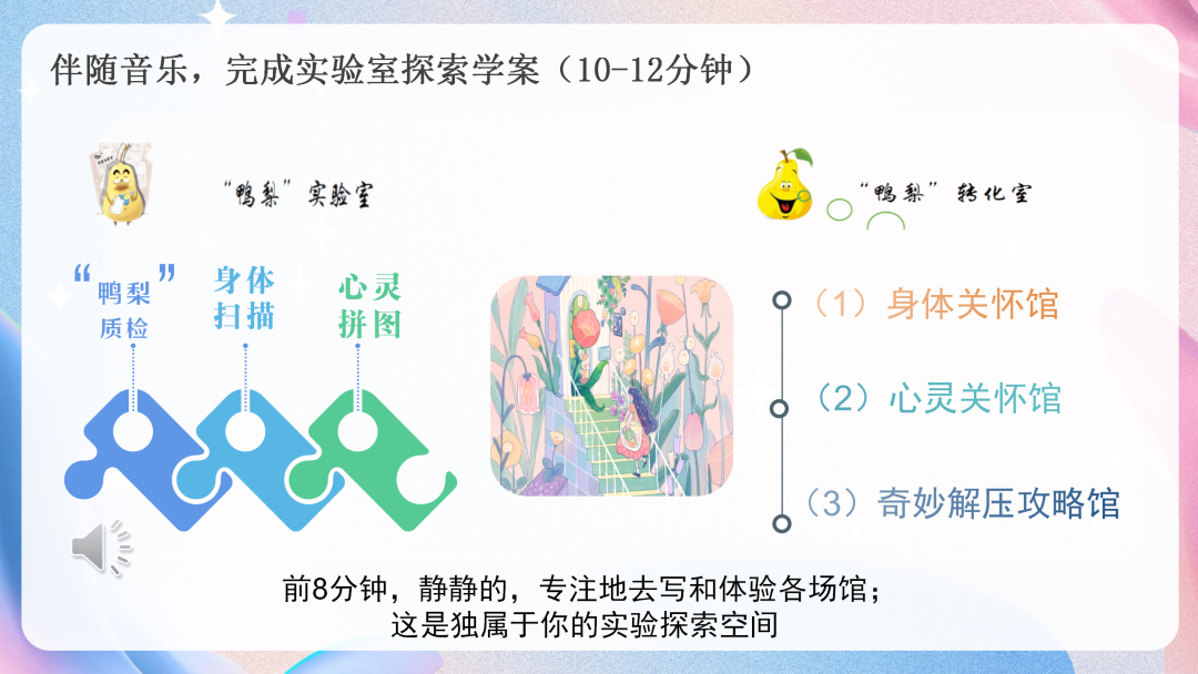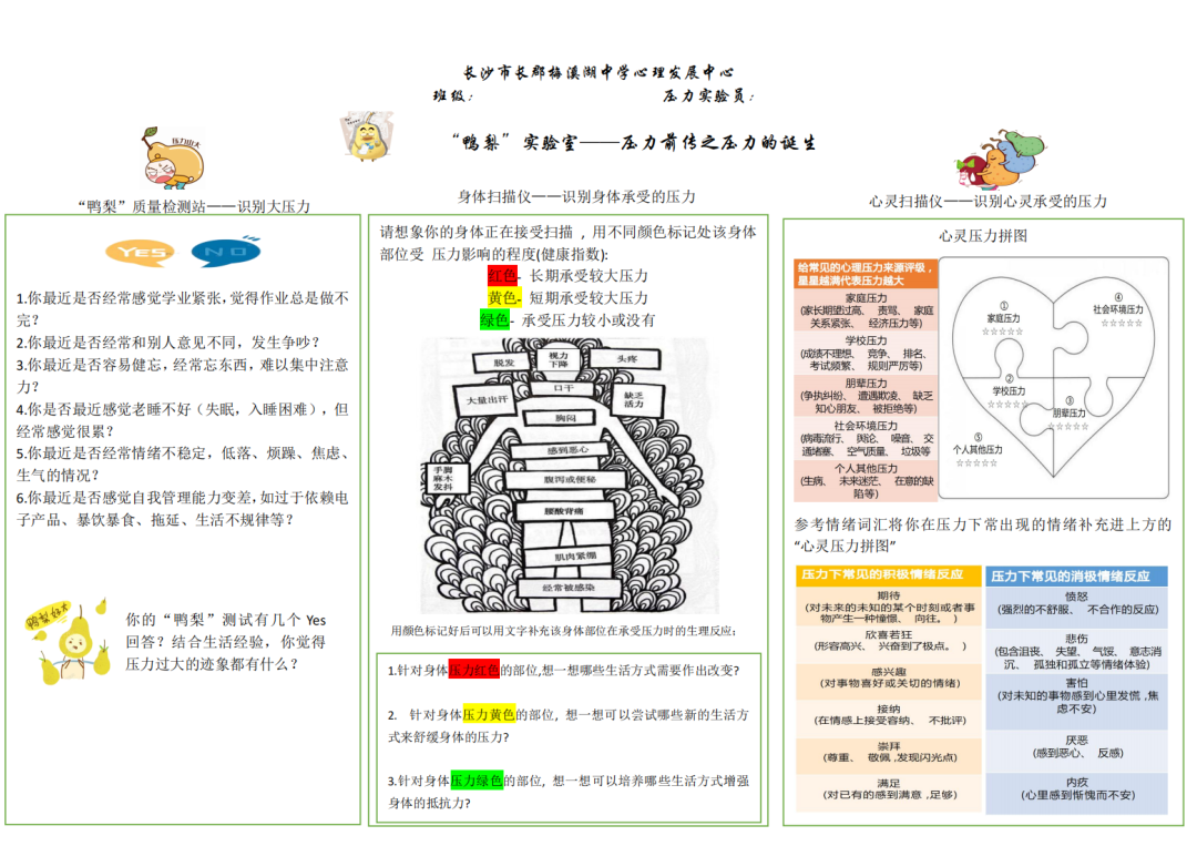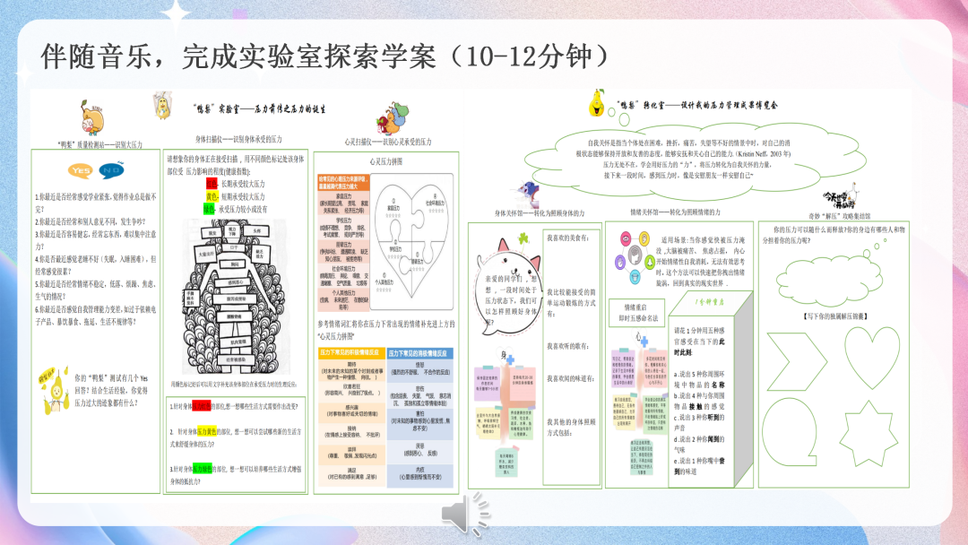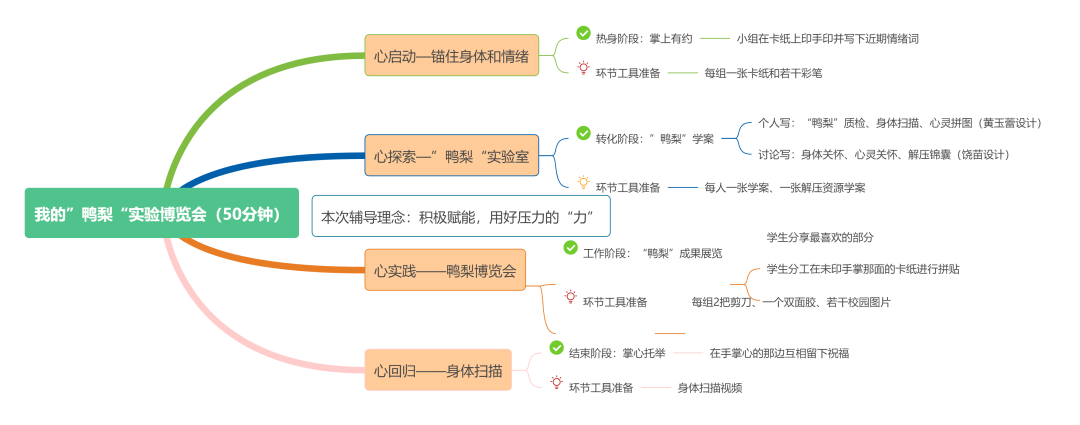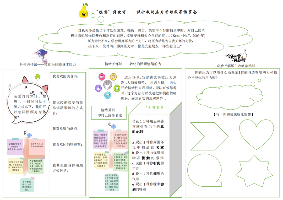 在初步设计高三班级释压团辅内容时,我想起曾经看到过北雅中学黄玉蕾老师设计的《压力自助手册》的心理课。内容丰富有质量,融合压力测试、身体扫描和心灵扫描作为“鸭梨”的诞生部分的内容;同时参照“自我关怀”的理念,搜索网络上身心关照不同方式,加上蕾蕾老师推荐的“即时”五感法,结合设计了“鸭梨“转化室的内容,主内容便如此定下来了。
