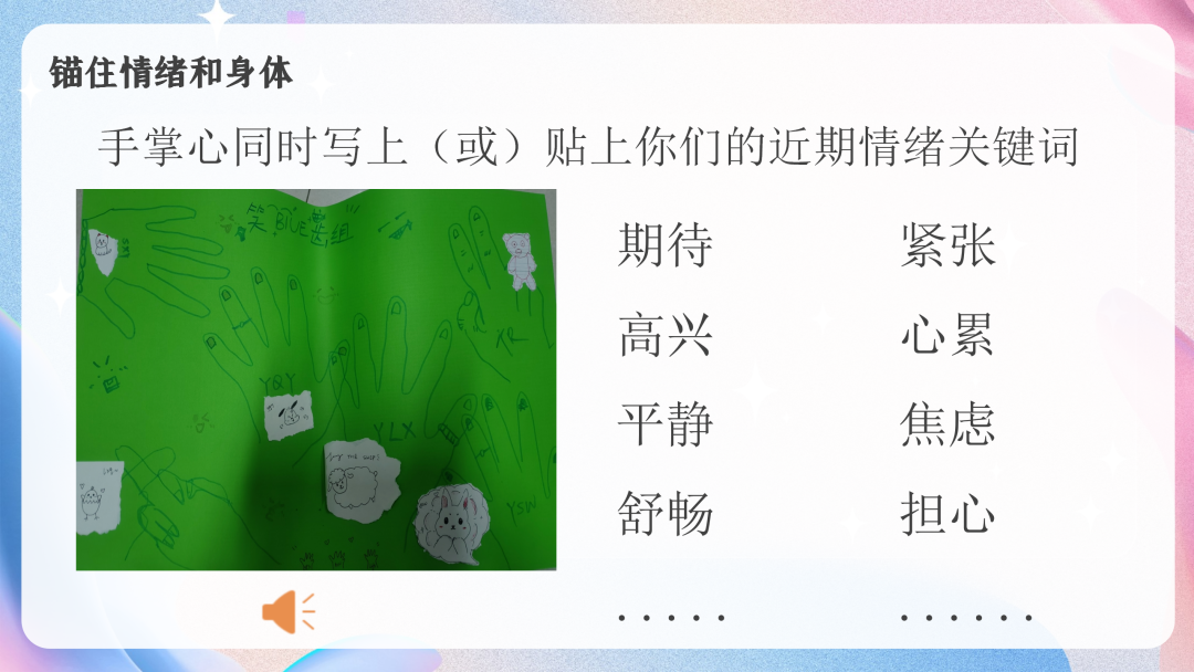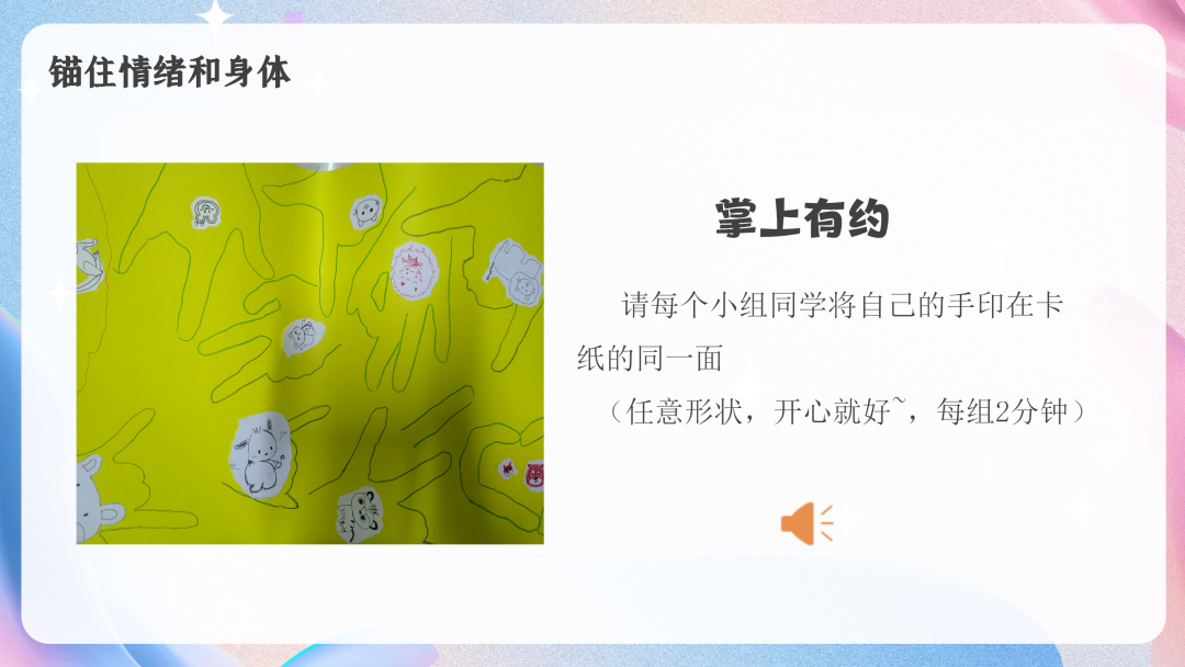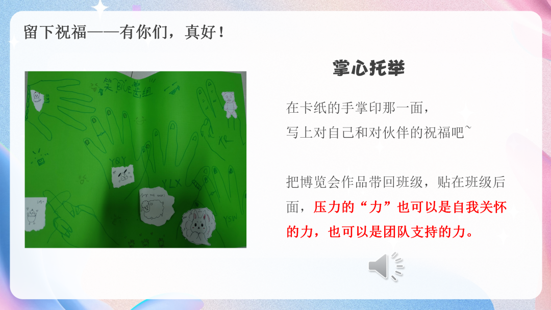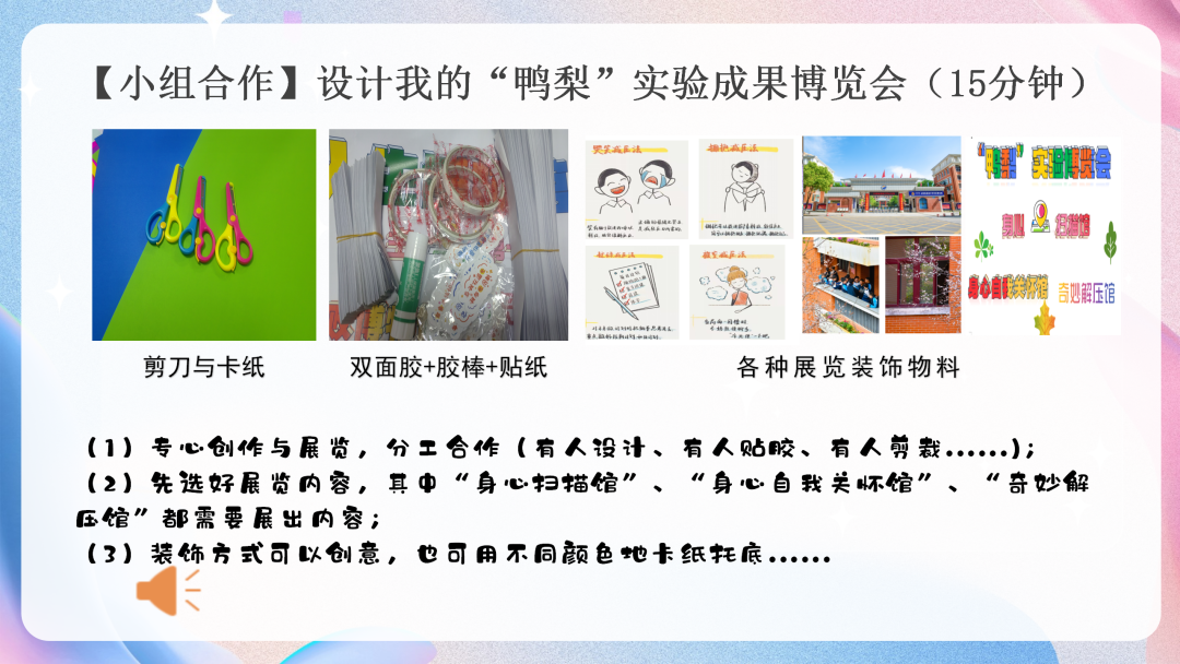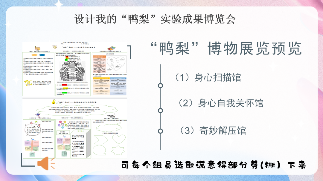 那如何将其“活动化”呢?化用了曾经在初二年级进行的人生博物馆课程时小组拼贴的方法,尝试在拼贴和玩的过程中激发团体的兴趣,凝结团体心动力。这样一来让同学们在小组合作下筛选展览出高人气解压锦囊,并将作品带回教室粘贴展览。