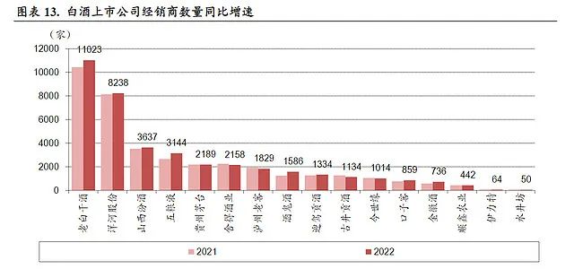 酒鬼酒、金徽酒、五粮液经销商数量增长最快,分别增26.3%、25.0%、18.4%,绝对数增加330家、147家、488家。