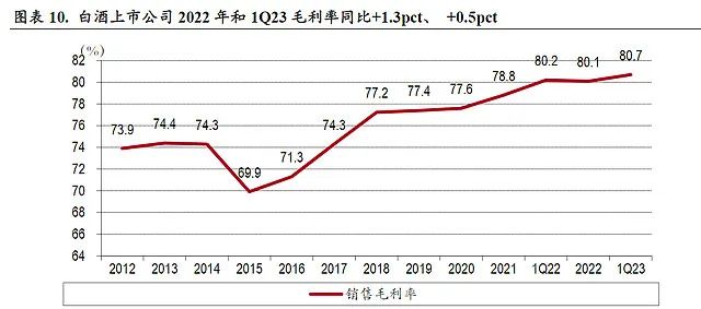 最近10年来,上市酒企的毛利率是不断上升的,今年一季度同比提高了0.5个百分点。茅台的毛利率是93%!