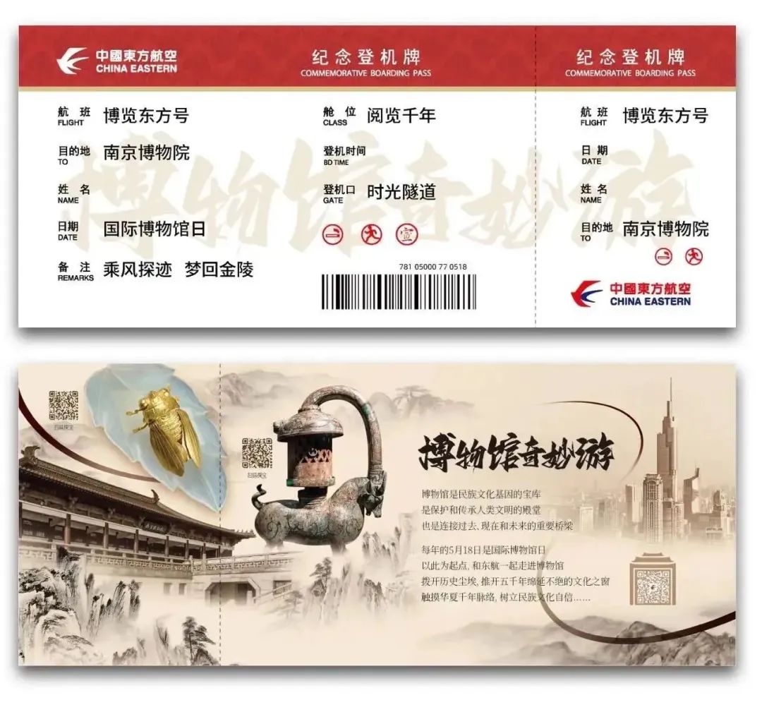 “欢迎乘机,今天是国际博物馆日,送您一张纪念登机牌。”在登机口,一位乘务员将精心制作的“国际博物馆日纪念登机牌”发放到旅客手上。纪念登机牌背面设计了南京博物院的大殿以及两件“镇院之宝”的图案,旁边还有二维码,扫码后可以了解这两个“镇院之宝”文物的故事。