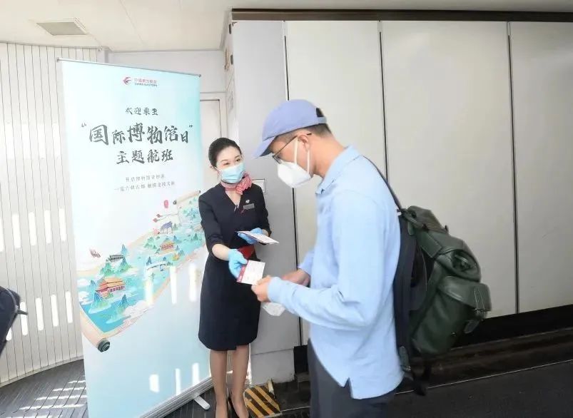 东航还在登机口旁摆放了一幅印有“欢迎乘坐‘国际博物馆日’主题航班”的易拉宝,十分醒目,让乘机旅客从登机的那一刻起就对这段不一样的航程有了期待。