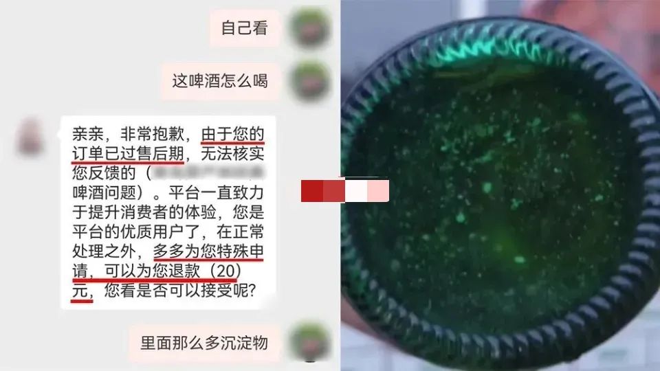 我在某多多购物平台买的啤酒,1箱15.99元,1箱有12瓶,我买了5箱花了79.95元。我都喝完1箱了才发现,啤酒里有漂浮物,我赶紧拿手机拍下来,发给平台人工客服看。