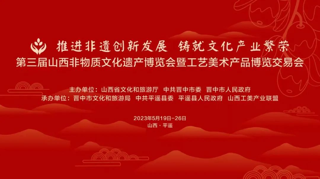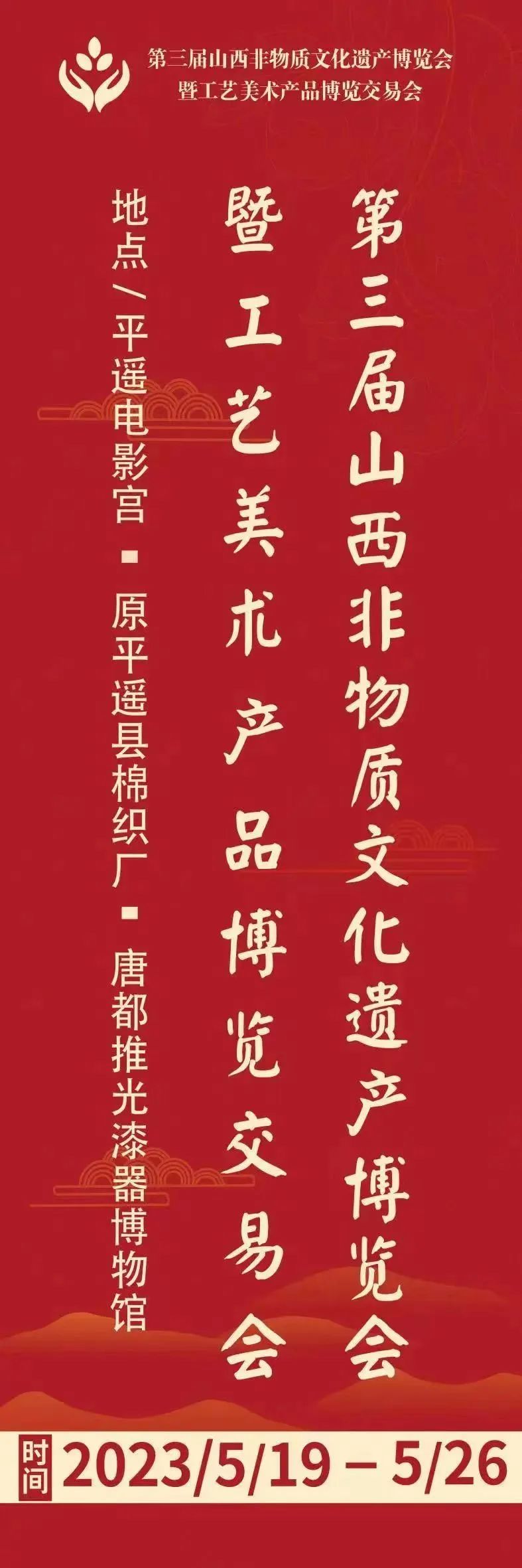 2023年5月19日(中国旅游日)至5月26日,第三届山西非物质文化遗产博览会暨工艺美术产品博览交易会在平遥古城的电影宫(国际电影展址)、原棉织厂(国际摄影节展址)、唐都推光漆器博物馆(国家级文化产业示范基地)展览展销展演。