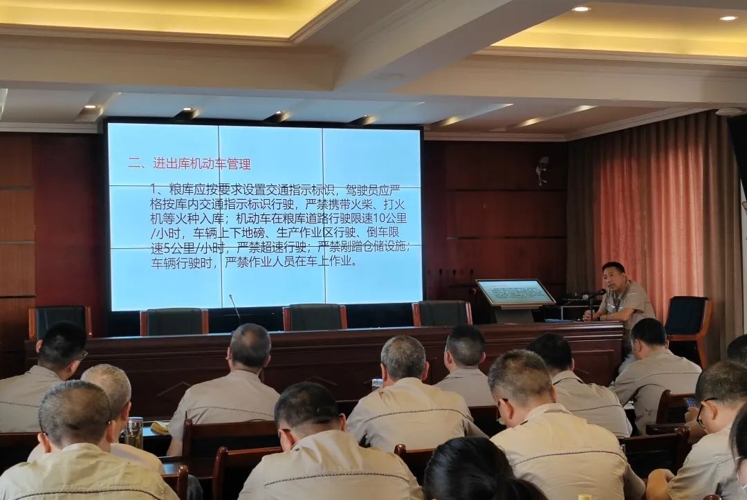 会前,集体观看了《守护大国粮仓》警示教育片,强调执行好政策法规,严守收购纪律,做到警钟长鸣。还结合汛期、高温等情况,要求做好收购期间安全生产工作,并进行了粮食出入库作业安全培训,确保收购安全。