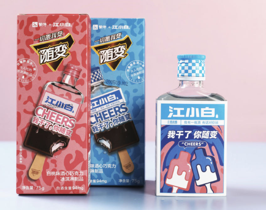 其次是物种跨界,物种跨界最常规的操作方式,不外乎白酒品牌与其他食品种类携手打造新物种。比如2022年上市的茅台冰淇淋,主打青梅煮酒、经典原味和香草口味,价格在50、60左右;还有以文案和年轻化营销出圈的白酒品牌江小白在2020年与蒙牛的随变棒冰结合,以经典的酒心巧克力为基底,出品了焦糖和白桃两种口味的雪糕;前两年推出的汾酒酒心巧克力也着实圈了一波粉。