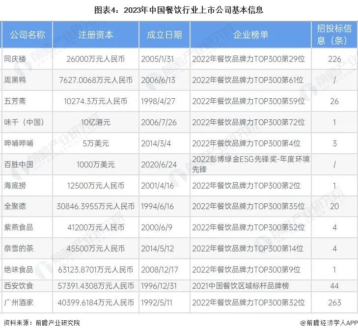 从餐饮行业的上市企业布局和已有公开信息分析,注册资本最多为味千(中国)(00538.HK);招投标信息最多的上市企业为广州酒家(603043.SH);而成立时间最早的是广州酒家(603043.SH)。