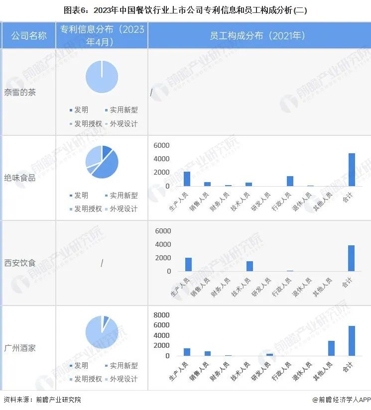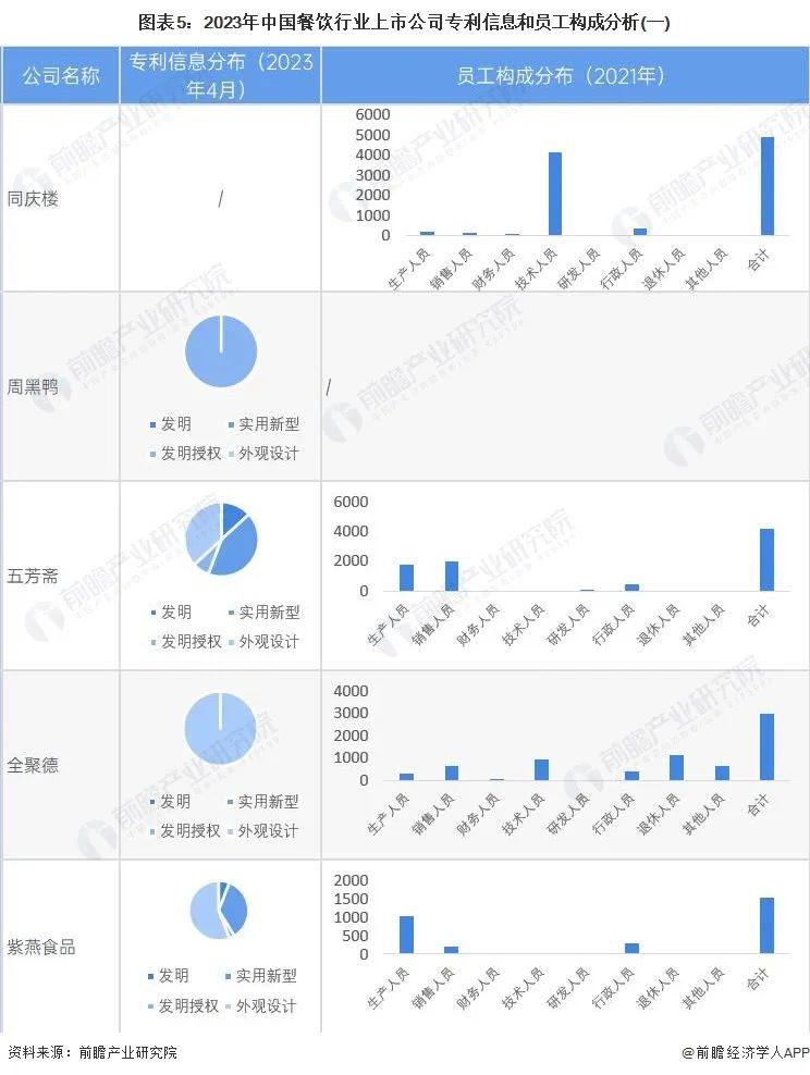 从餐饮行业的上市企业已有的公开信息分析,专利信息相对较多的企业是五芳斋(603237.SH);员工总数最多的是广州酒家(603043.SH)。