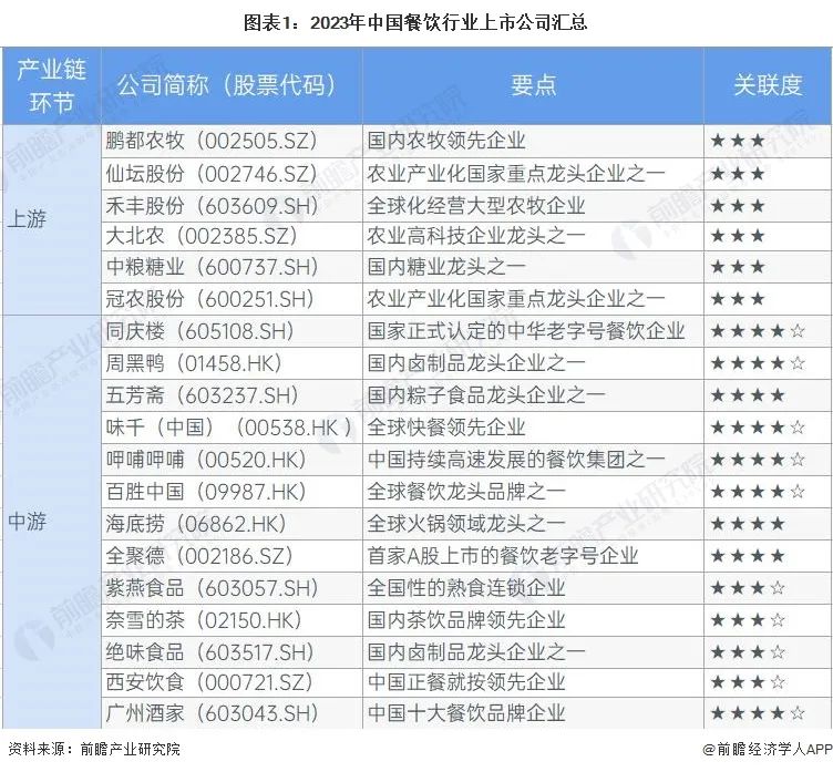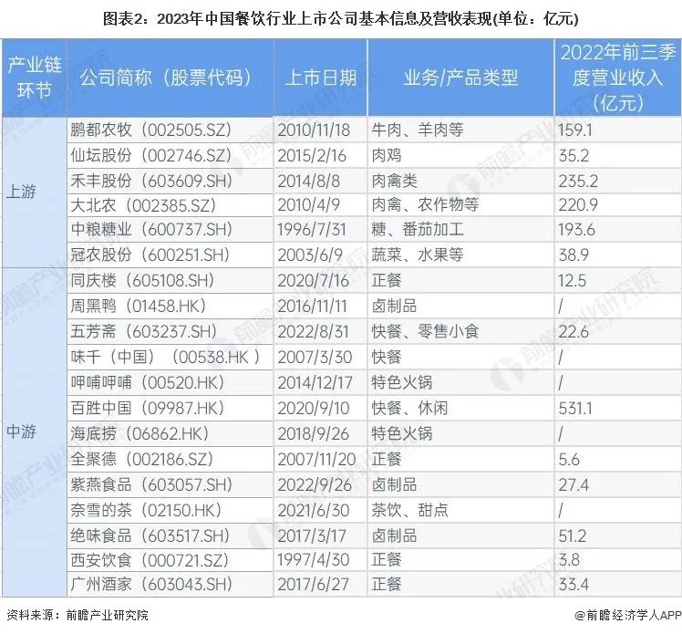 餐饮行业上游为供应商,上市企业有鹏都农牧(002505.SZ)、仙坛股份(002746.SZ)、禾丰股份(603609.SH)等;中游为餐饮服务商,包括同庆楼(605108.SH)、周黑鸭(01458.HK)、五芳斋(603237.SH)、味千(中国)(00538.HK)等;下游为消费市场。具体上市公司信息如下: