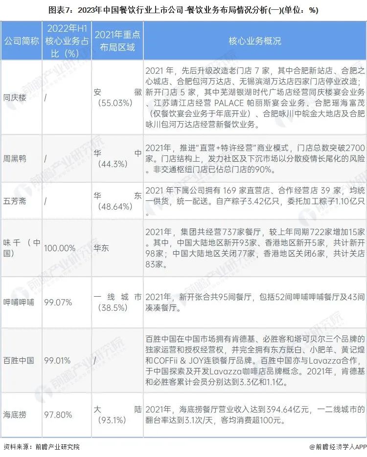 从业务布局来看,核心业务占比方面,呷哺呷哺(00520.HK)、百胜中国(09987.HK)、海底捞(06862.HK)和全聚德(002186.SZ)等企业均在95%以上,表明上述企业的业务较为集中;重点布局区域方面,各大上市企业多以境内业务为主,又以华东地区为主;核心业务概况方面,海底捞(06862.HK)在一二线城市的翻台率达到3.1次/天。