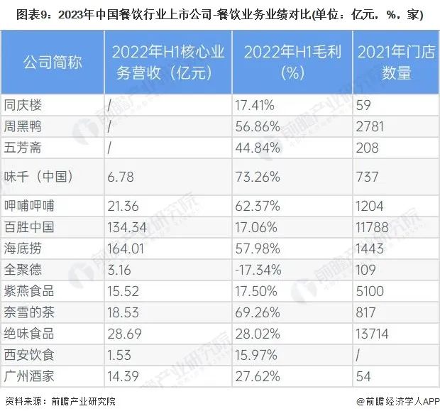 有关餐饮业务的业绩情况,2022年上半年,海底捞(06862.HK)的核心业务营收最高;味千(中国)(00538.HK)的毛利水平较高。2021年绝味食品(603517.SH)的,门店数量最多。
