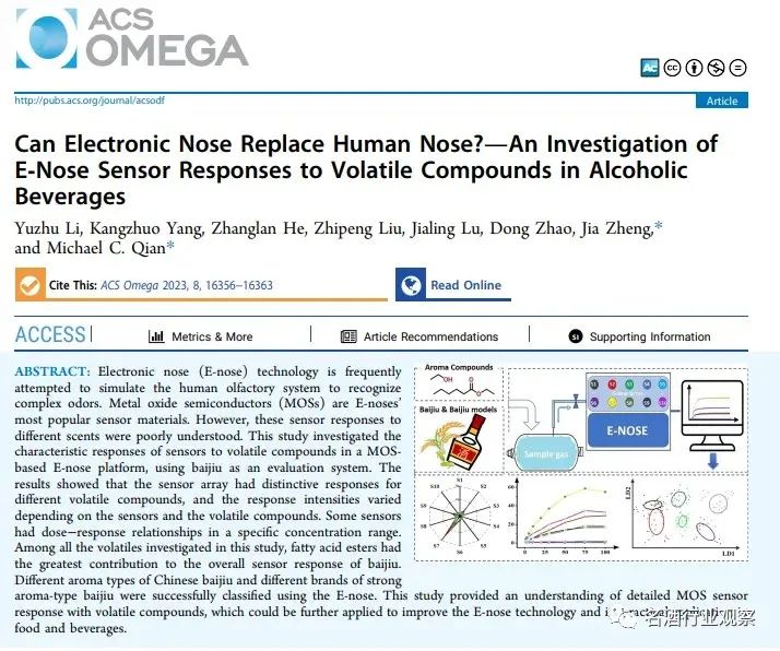 近日,五粮液风味研究团队在国际期刊《ACS Omega》以封面文章的形式发表《电子鼻能代替人类的鼻子吗?关于电子鼻传感器对酒精性饮料中挥发性成分响应的研究》。