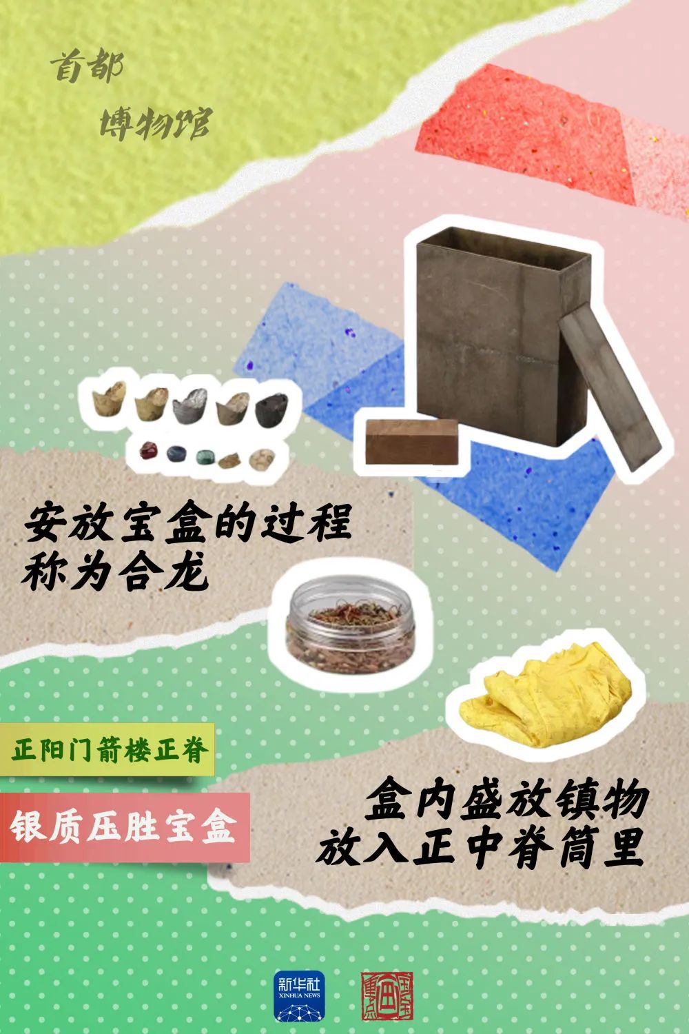 正在北京首都博物馆举行的“辉煌中轴”展览上,正阳门正脊上银质压胜宝盒引人注目。这个从正阳门箭楼正脊取出来的宝盒,是能代表北京城市营造特色的文物之一。压胜宝盒是规模较大的建筑在修建过程中,于正脊位置专门放置的盒子,有趋吉避凶的寓意。