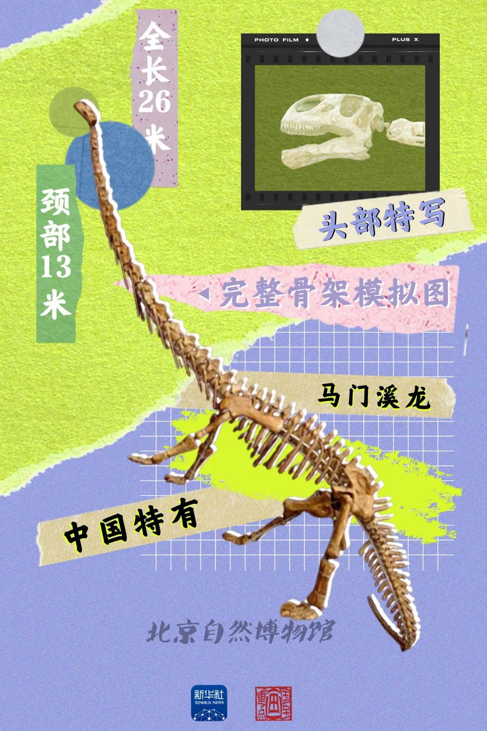 走进北京自然博物馆古爬行动物展厅,有一件标本会让人过目不忘,那便是马门溪龙的化石。马门溪龙体型虽大,但头很小,是中国特有的恐龙。