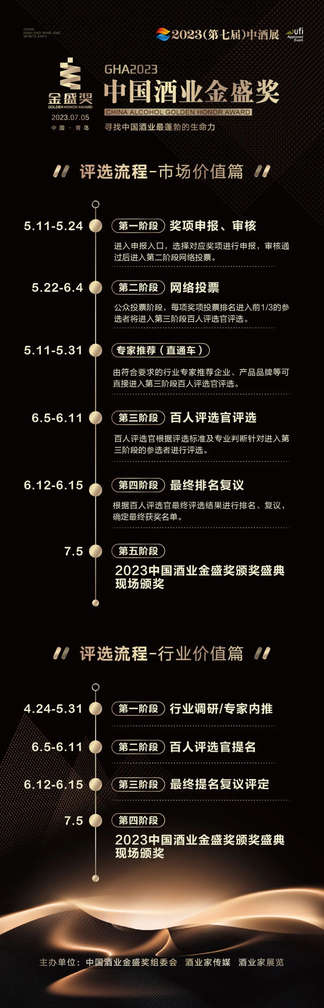 据悉,中国酒业金盛奖(市场价值篇)从申报到奖项公布,共分5大环节:5月11日-5月24日,奖项申报、审核;5月22日-6月4日,网络投票;5月11日-5月31日,专家推荐(直通车);6月5日-6月11日,百人评选官评选;6月12日-6月15日,最终排名复议;7月5日,颁奖盛典,奖项榜单正式公布。