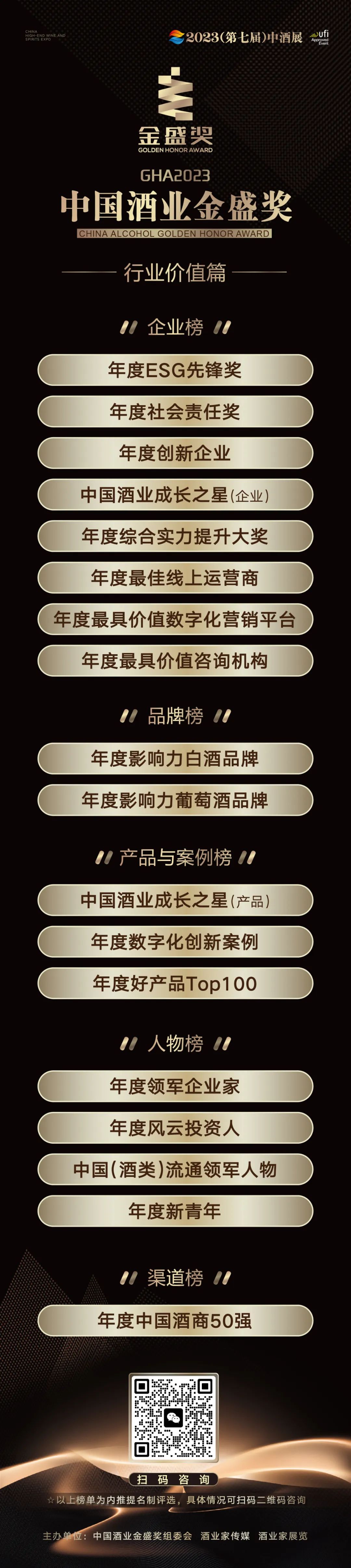据了解,2023中国酒业金盛奖,分为中国酒业金盛奖(市场价值篇)和中国酒业金盛奖(行业价值篇),共设置了“企业榜”、“品牌榜”、“产品与案例榜”、“人物榜”、“渠道榜”5大榜单,29项大奖。