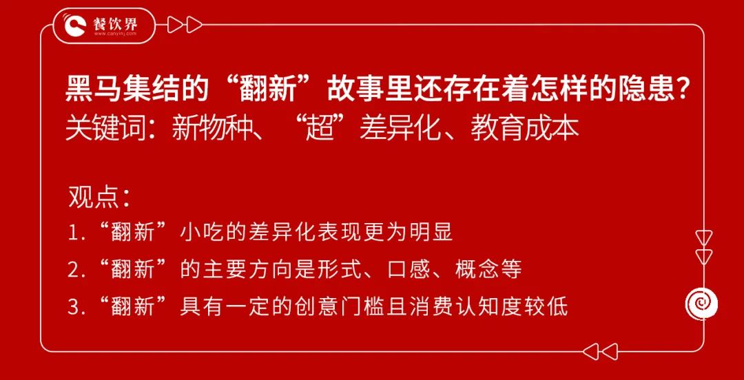 从“翻红”到“翻越”,再到“翻新”,从前到后这些“翻拍”故事的差异化表现越来越明显,仅从差异化壁垒来看,“翻新”的小吃表现更为突出。所以,在小吃“翻新”的故事中,常有“出圈”的黑马出现。但同时,从传统品类到“新”品类的蜕变,“翻新”的弊端也非常明显。