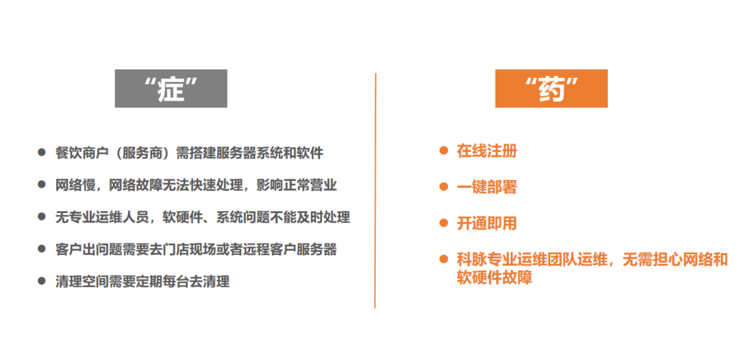 科脉云餐谋SaaS以高配云服务器、支持快速扩容、无硬件故障担忧等优势,针对性解决了传统餐饮软件的痛点;低成本的上云服务帮助商家省钱省心,降低体验与试错环节的成本。