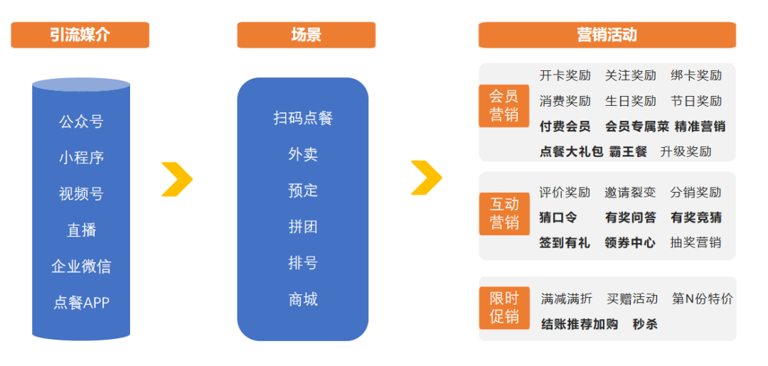 科脉云餐谋SaaS拥有强大的全域营销能力,可帮助商家高效制定不同平台、不同场景下的各类特色营销活动,提升营销链路中的拉新、留存、激活、转化、复购能力。