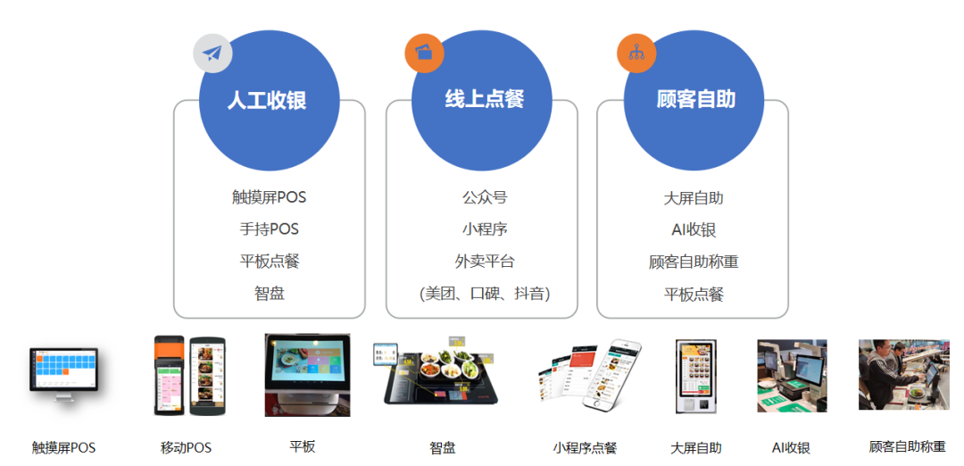 在门店收银层面,多种提效收银点餐方案也为餐饮行业带来了全新的思路,如混合业态可支持中餐、快餐、外卖、自选模式任意切换;收银方式也满足人工收银、线上点餐、顾客自助等多种需求。