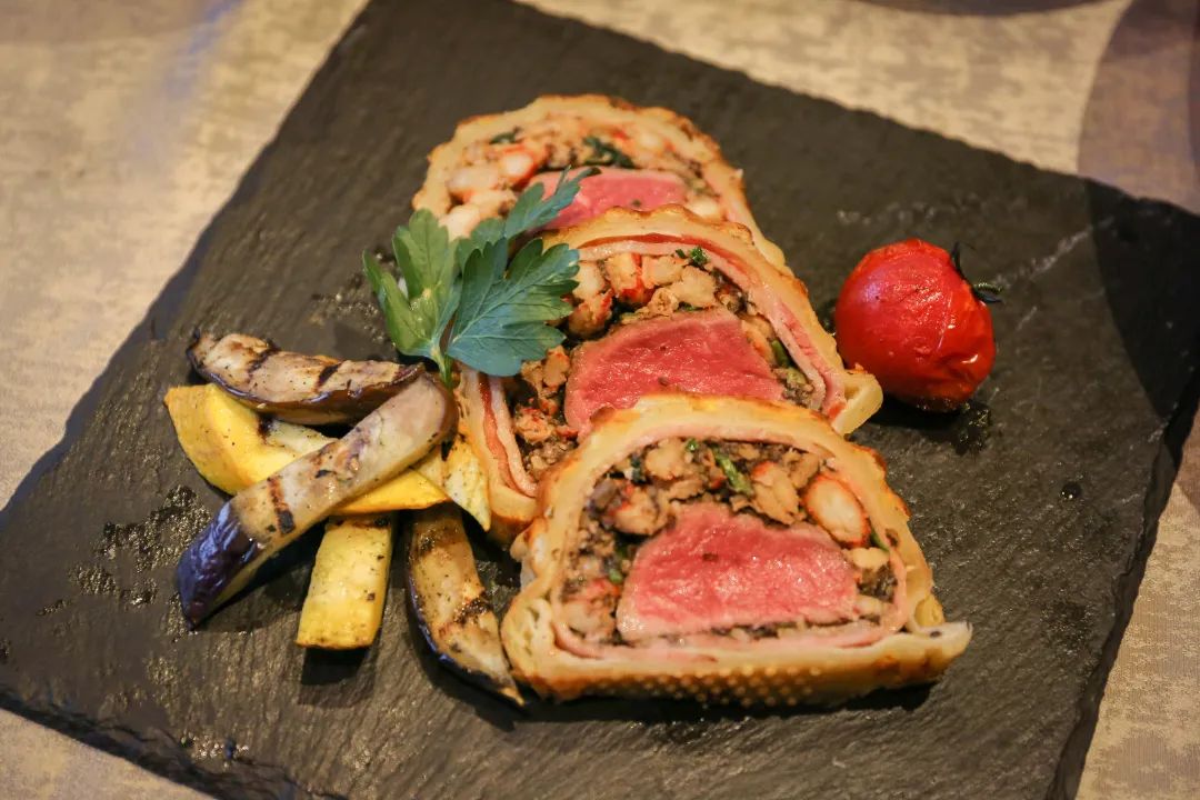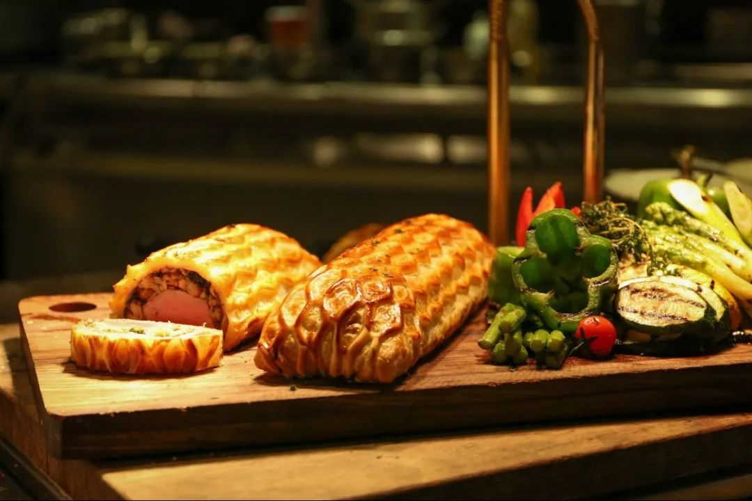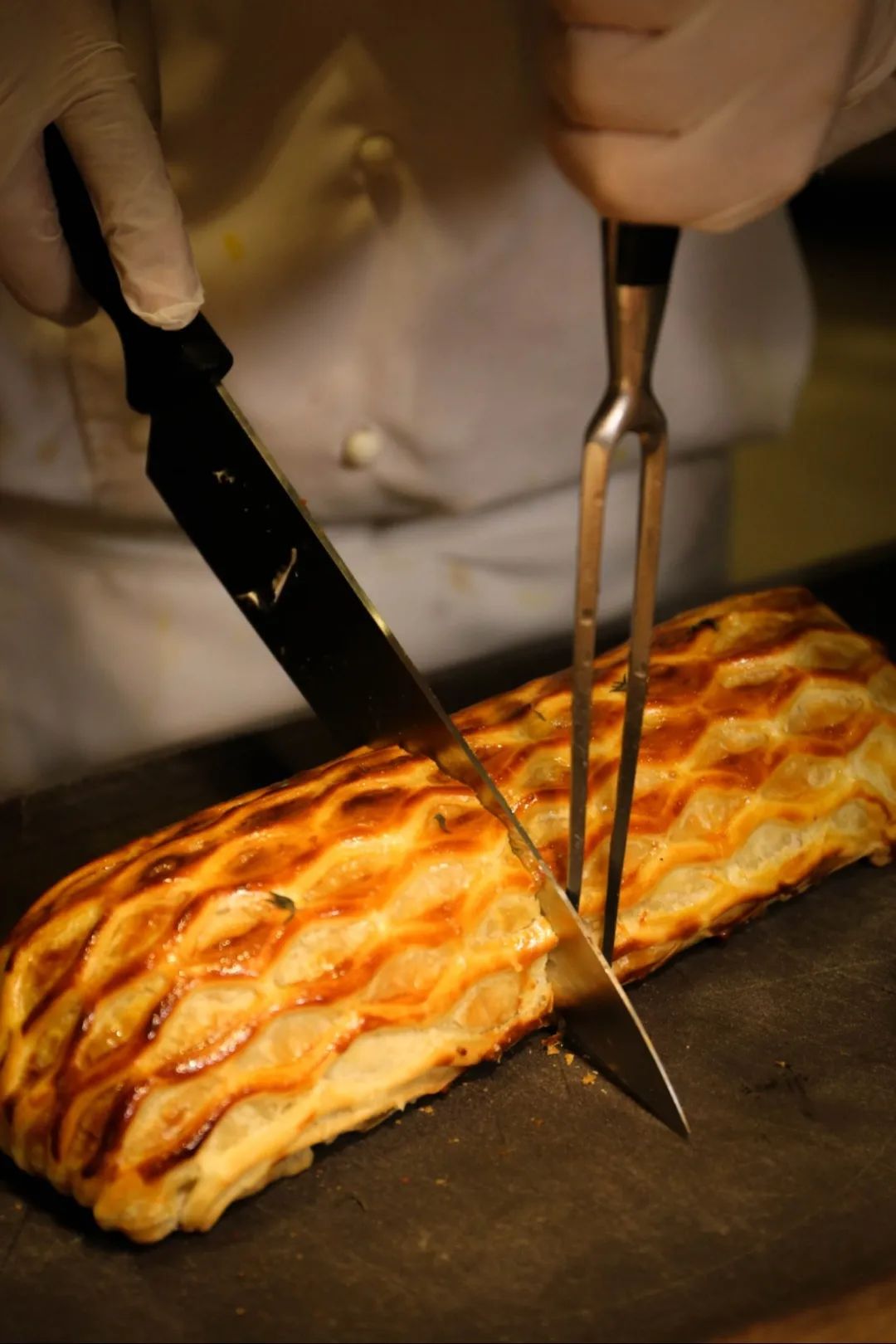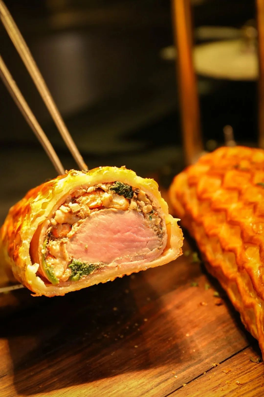大厨挑选柔嫩的菲力牛排中段,大火煎烤上色,配以捣碎的蘑菇泥和火腿片,裹酥皮刷蛋液,切开侧面看到那销魂的肉粉色和小龙虾,足以让爱虾爱肉一族兴奋到模糊!