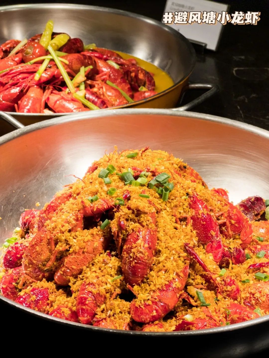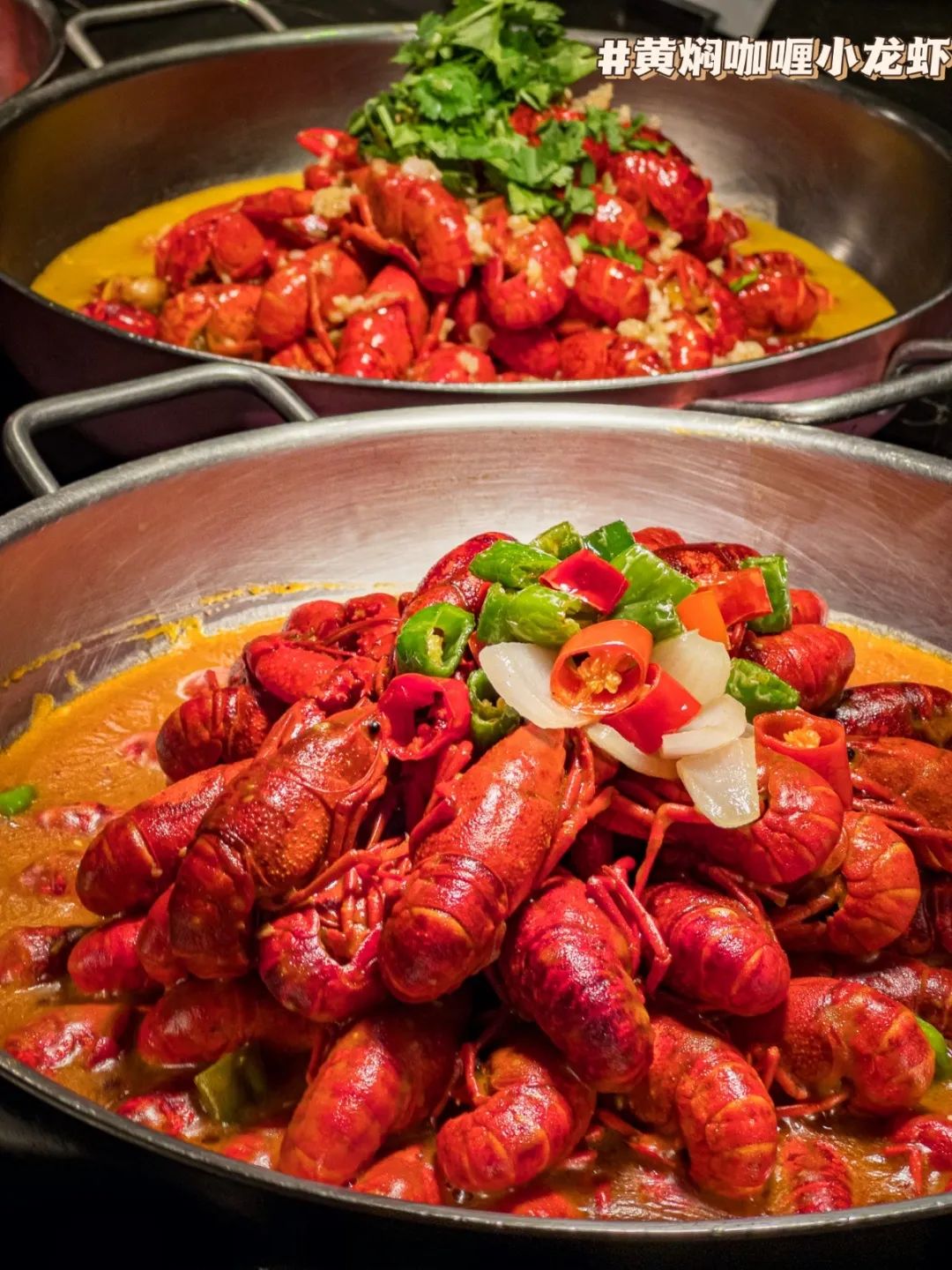 黄焖咖喱小龙虾:金黄的色泽,让人食欲大开,加上完全浸泡在汤汁里,入味程度max!略带着辛辣口感的咖喱小龙虾,十分惊艳!避风塘小龙虾:炸得金黄的大蒜末芳香浓郁,面包糠又脆又酥,包裹着筋道弹韧的小龙虾让人爱不释手!