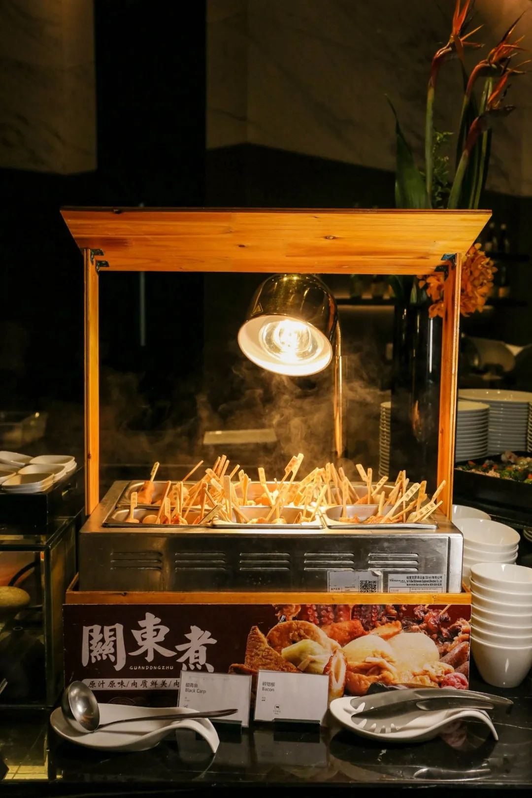 还差些日系氛围?直接将关东煮小店搬进酒店!一排四宫格锅放得是满满当当,种类选择超级多!好想每样都来一个,强烈安利的龙虾沙拉丸,一口爆浆,一定要试试!