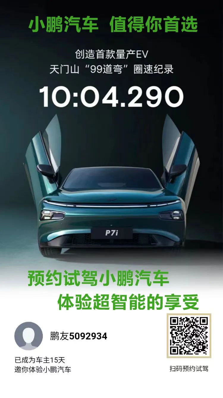 亲!你是不是准备选购新能源汽车,告诉你,小鹏超智能新能源汽车你一定要考虑。赶快行动,长按以上二维码,小鹏车主5092934,诚邀你体验小鹏汽车超智能的驾驶乐趣。