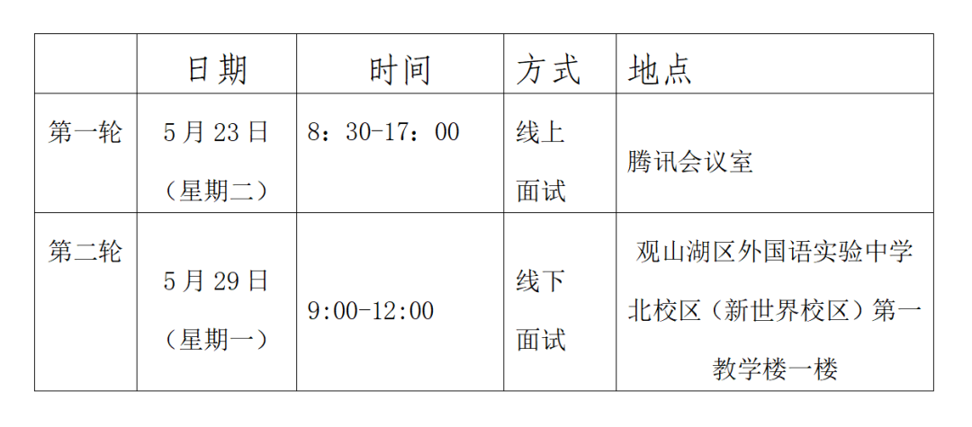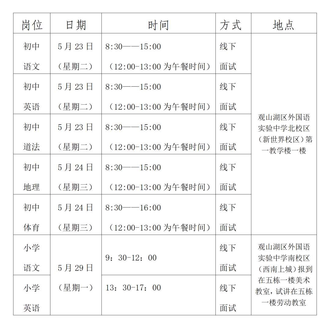 (一)参加线下面试考生:请于初评当日公布时间前30分钟凭有效《居民身份证》原件,并携带本次引进所学的本硕学历证明(应届毕业生就业推荐表)、教师资格证、普通话证、职称证明原件及复印件,到观山湖区外国语实验中学南校区5栋一楼“劳动教室”(小学语文和小学英语)或观山湖区外国语实验中学北校区第一教学楼一楼 (初中岗位)报到。公布面试开始的时间仍未到达指定地点候考的初评考生视为自动弃权(原则上开展线下初评,确实来筑不便的考生可申请线上初评,但需要笔试或专业测试的除外);证件与本人不符或证件不全的,取消初评资格。