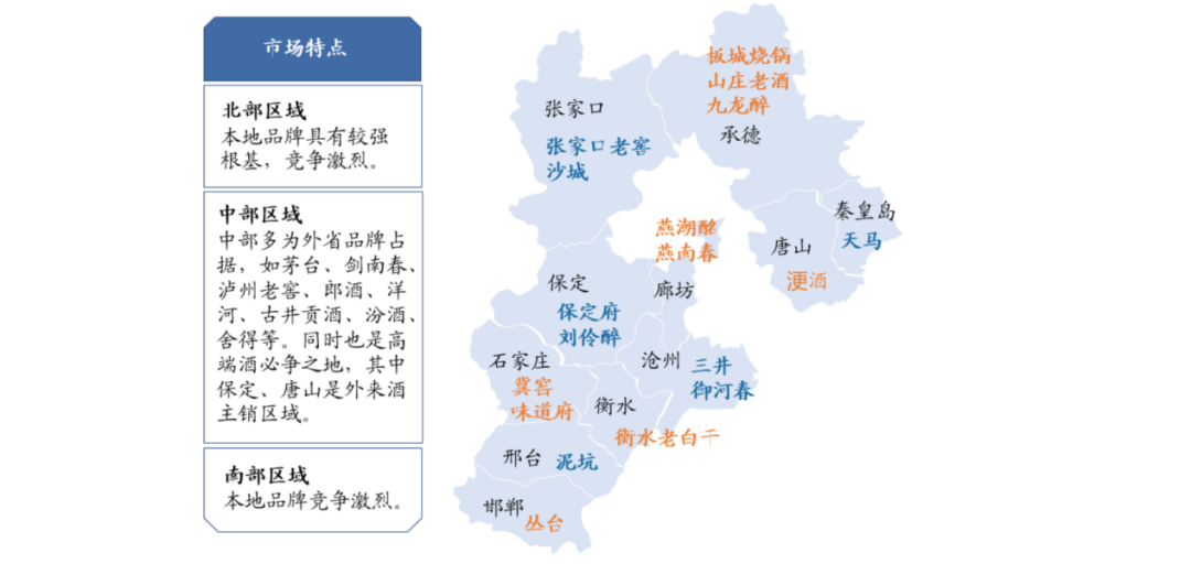衡水老白干本部扎根河北,以衡水、石家庄基地市场,逐步发力突破唐山保定;山庄则主要分布承德、唐山等区域;丛台以邯郸为中心向周边扩散;板城烧锅以承德为核心市场;泥坑占据邢台;十里香割据沧州。