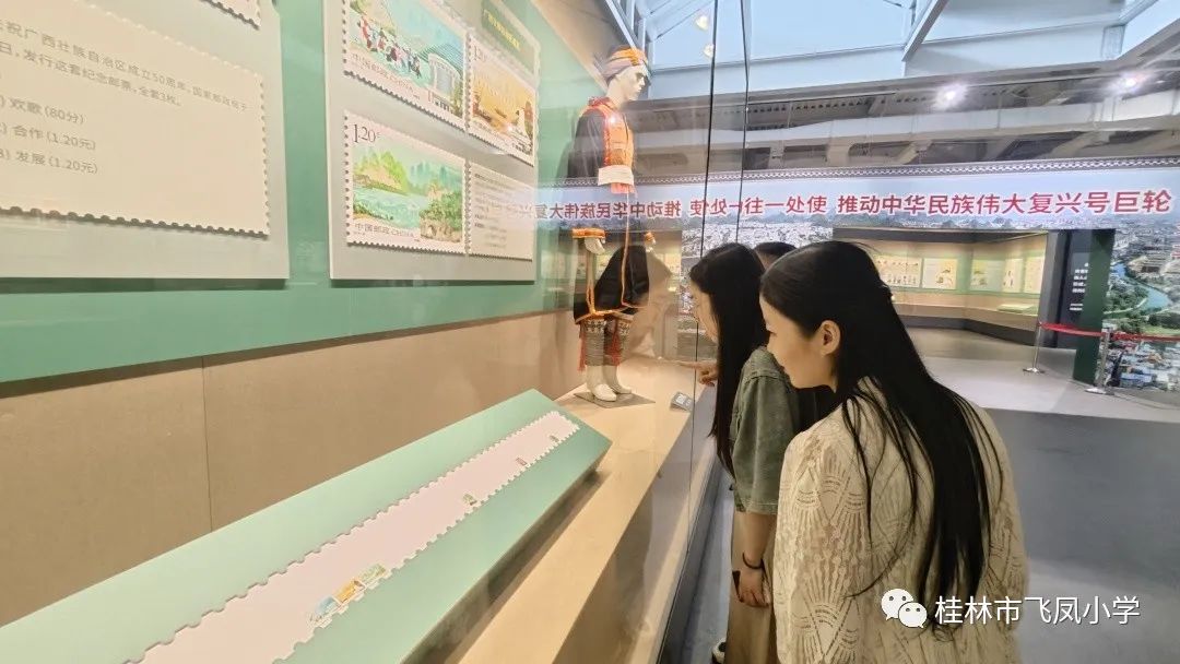 2022年桂林成功创建成为全国民族团结进步示范市,此次巡展,是桂林市巩固拓展民族团结进步创建成果的一项重要举措,是全市“铸牢中华民族共同体意识,奋力打造世界级旅游城市”的一次重要活动。桂林邮票巡展共分为三个部分,以邮票时间为线索,形象直观地围绕民族团结、民族区域自治及民族地区政治、经济、文化、艺术发展,观看邮票展,就是重温党史;观看邮票展就是在观看桂林风光美景、历史文化、风土人情、物产资源、发展成就......飞凤小学党团员和教师代表认真聆听讲解,仔细观察每张邮票的设计元素,感受设计理念和蕴含的文化知识,不时拍照记录珍贵画面,于方寸中追寻党的历史根脉,感受党从一只小红船到一艘巍巍巨轮的奋斗足迹。