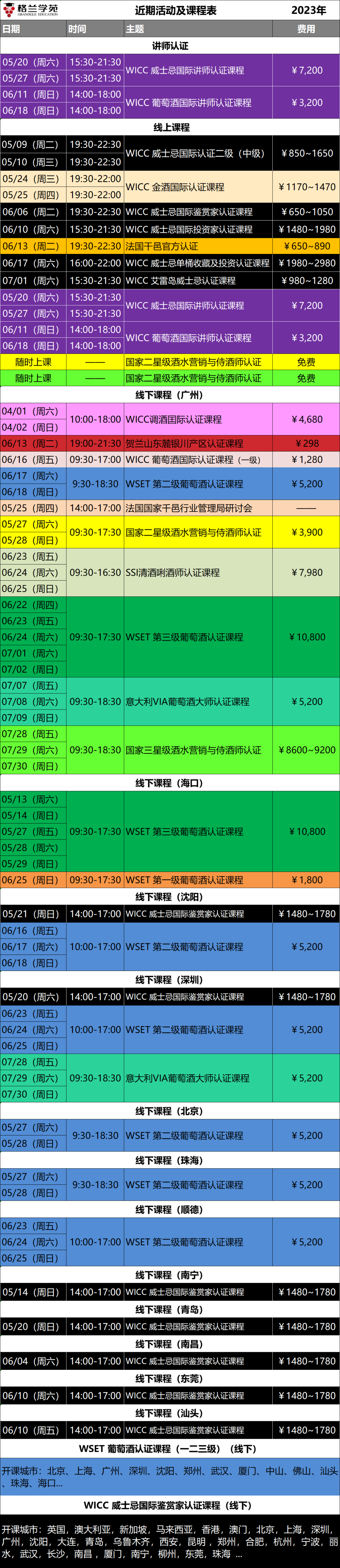 开课城市及时间如下