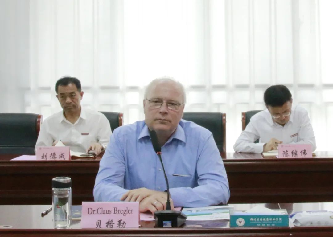苗相甫致欢迎辞,他首先对德国牙科技术协会的各位贵宾表示热烈的欢迎和诚挚的感谢。接着,他向各位来宾介绍了我校的概况,我校包含口腔学院、护理学院、康养学院在内等11个二级学院,同时拥有口腔医学技术,护理等共29个专业及方向。学校坚持多措并举,培养人才,全面落实职业教育法,实行开放性、多元化办学,不断拓宽毕业生就业途径,坚持产教融合,校企合作,谱写职业教育新篇章,最后预祝本次签约仪式圆满成功。