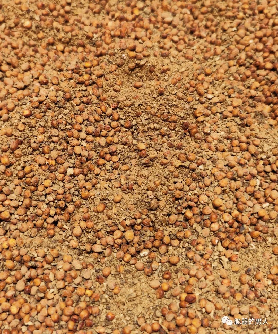 酒曲的本质就是养细菌或者微生物,养出足够多的微生物后,就把酒曲打成粉末,和高粱搅拌在一起(如下图),让高粱快速发酵,然后烤酒。